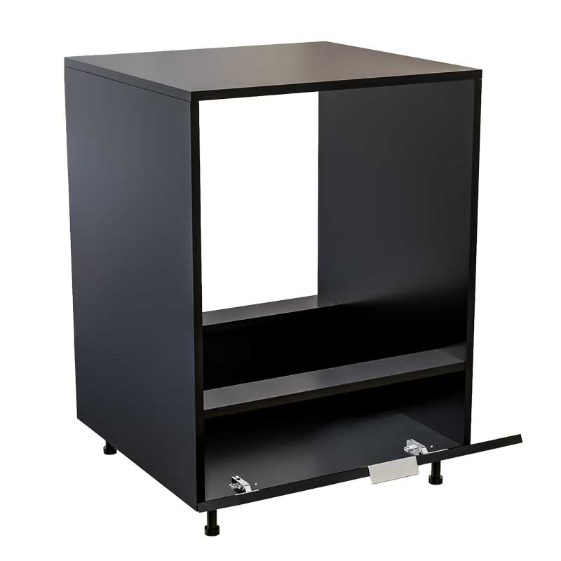 Corp inferior pentru cuptor incorporabil cu spațiu de depozitare. Design modern negru mat, PAL 18 mm cu cant ABS. Ideal pentru bucătării elegante și funcționale.
