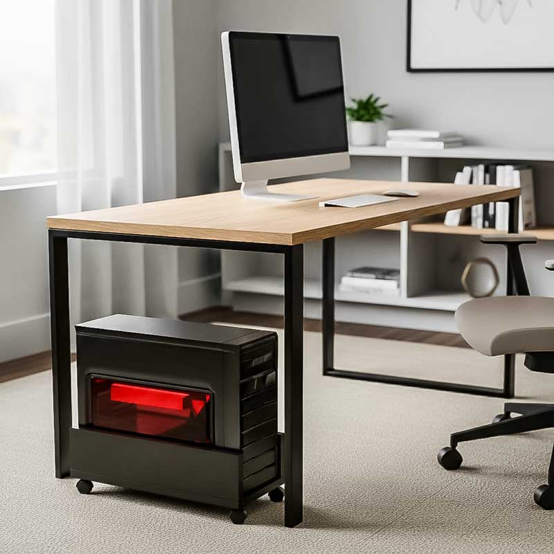 Suport mobil pentru unitate PC Lucmi, realizat din PAL de 18 mm în finisaj Negru Mat, cu cant ABS de 2 mm pentru durabilitate sporită. Prevăzut cu 4 roți rezistente, pentru stabilitate și deplasare ușoară. Dimensiuni compacte 25 x 45 x 15(h) cm, ideal pentru protejarea și aerisirea unității calculatorului.