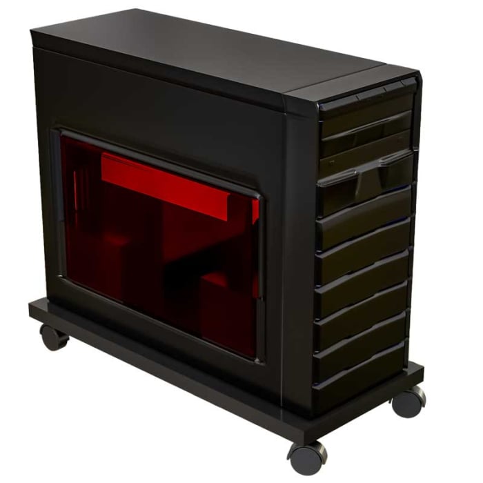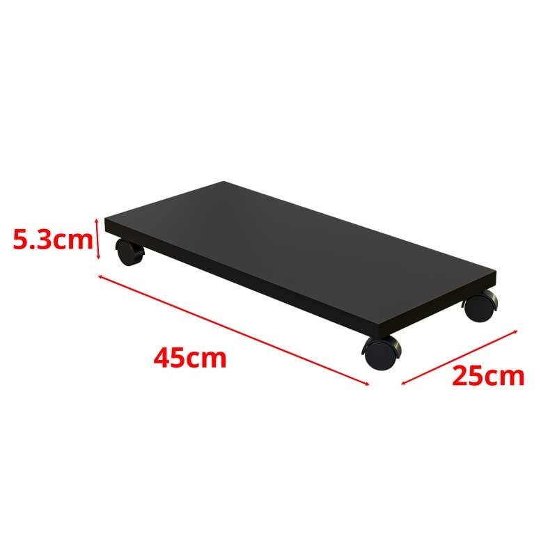 Suport mobil pentru unitate PC Lucmi, realizat din PAL de 18 mm în finisaj Negru Mat, cu cant ABS de 2 mm pentru durabilitate sporită. Prevăzut cu 4 roți rezistente, pentru stabilitate și deplasare ușoară. Dimensiuni compacte 25 x 45 x 5.3(h) cm, ideal pentru protejarea și aerisirea unității calculatorului.