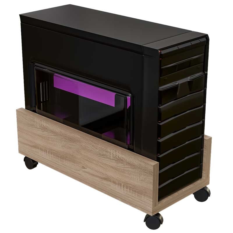 Suport mobil pentru unitate PC Lucmi, realizat din PAL de 18 mm în finisaj Stejar Natur, cu cant ABS de 2 mm pentru durabilitate sporită. Prevăzut cu 4 roți rezistente, pentru stabilitate și deplasare ușoară. Dimensiuni compacte 25 x 45 x 15(h) cm, ideal pentru protejarea și aerisirea unității calculatorului.